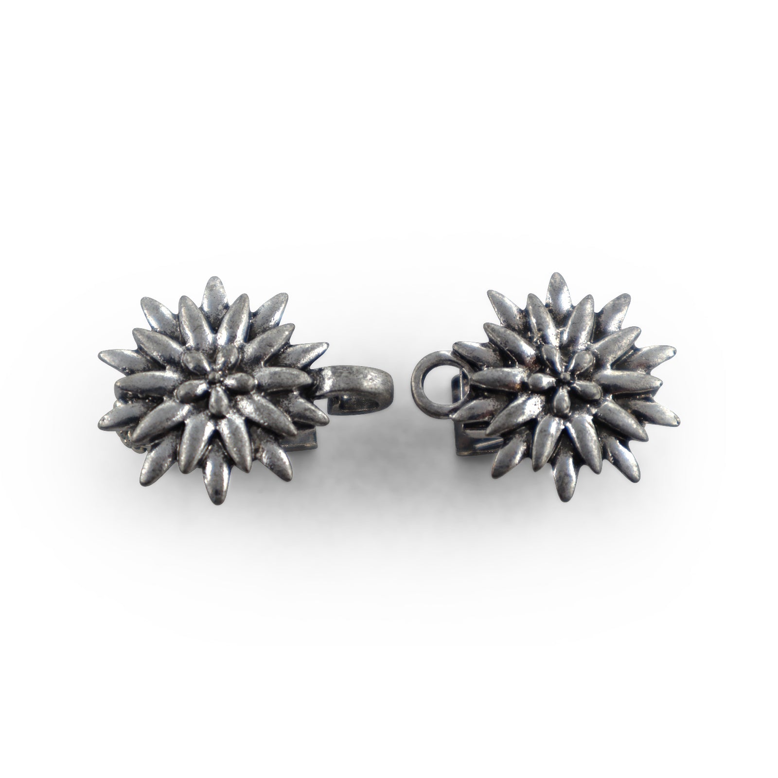 Un classico per sempre: questa clip per cardigan color argento con il fiore della stella alpina come radioso centrotavola.