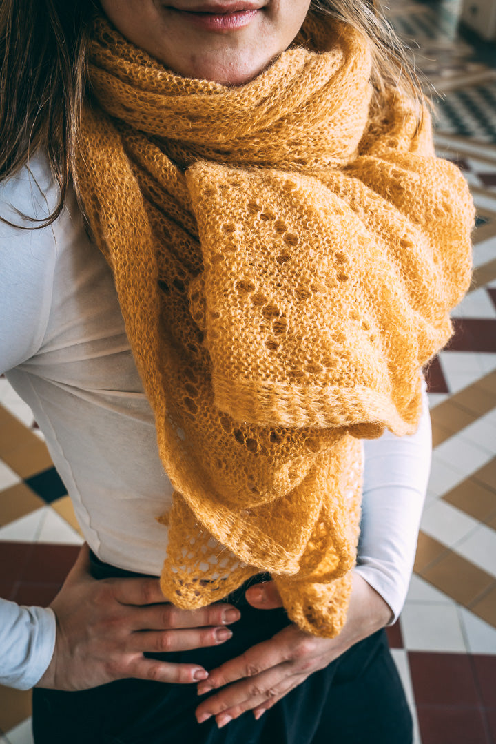 Mohair : polyamide en acryl zijn de bestanddelen van deze ajour gebreide sjaal van ongeveer 2 meter lengte bij 1 meter breed.